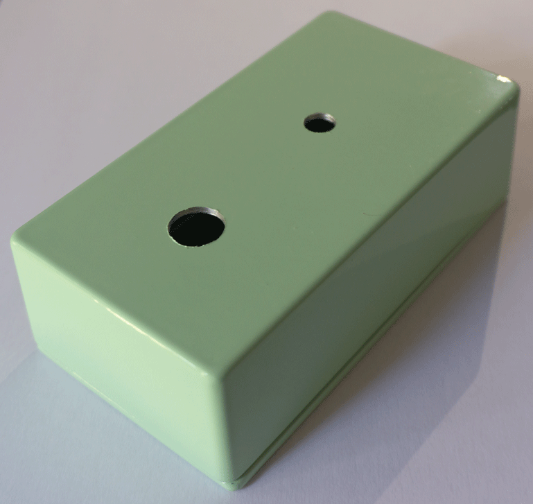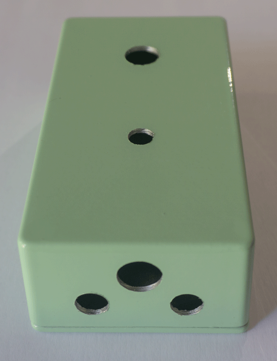 Overview of enclosure. Bottom hole for switch with a single hole drilled for the potentiometer.
